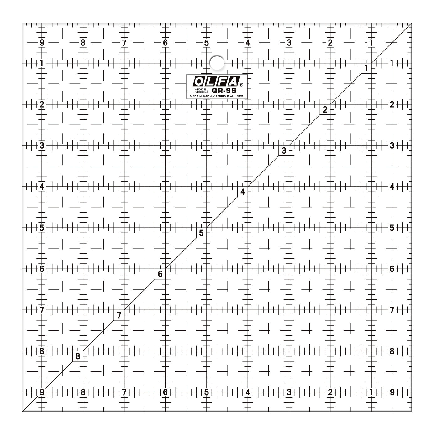 A régua acrílica OLFA QR-9S 9 1/2" Square Frosted Advantage™ é antiderrapante, o que a torna a régua perfeita para projetos de colchas ou tecidos.