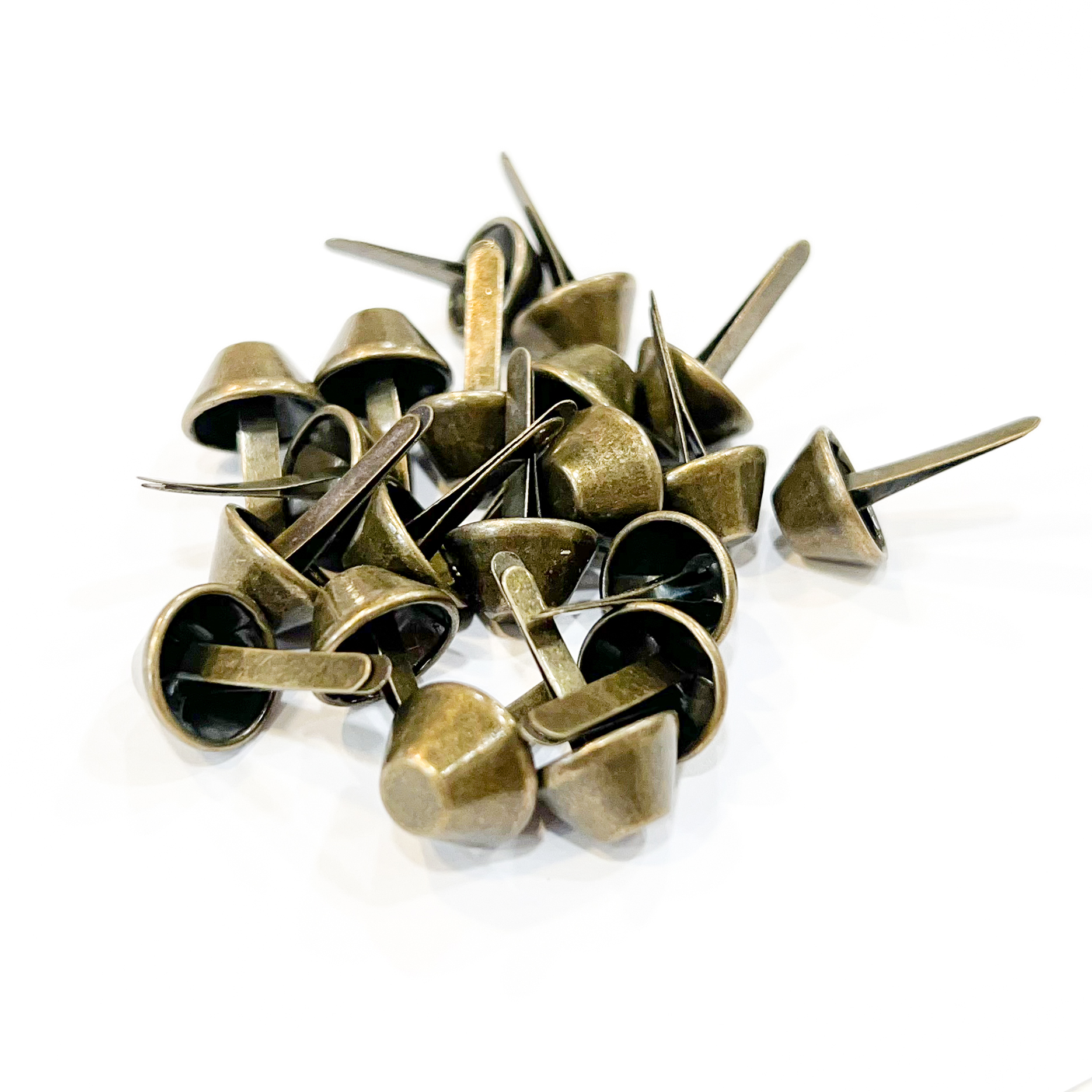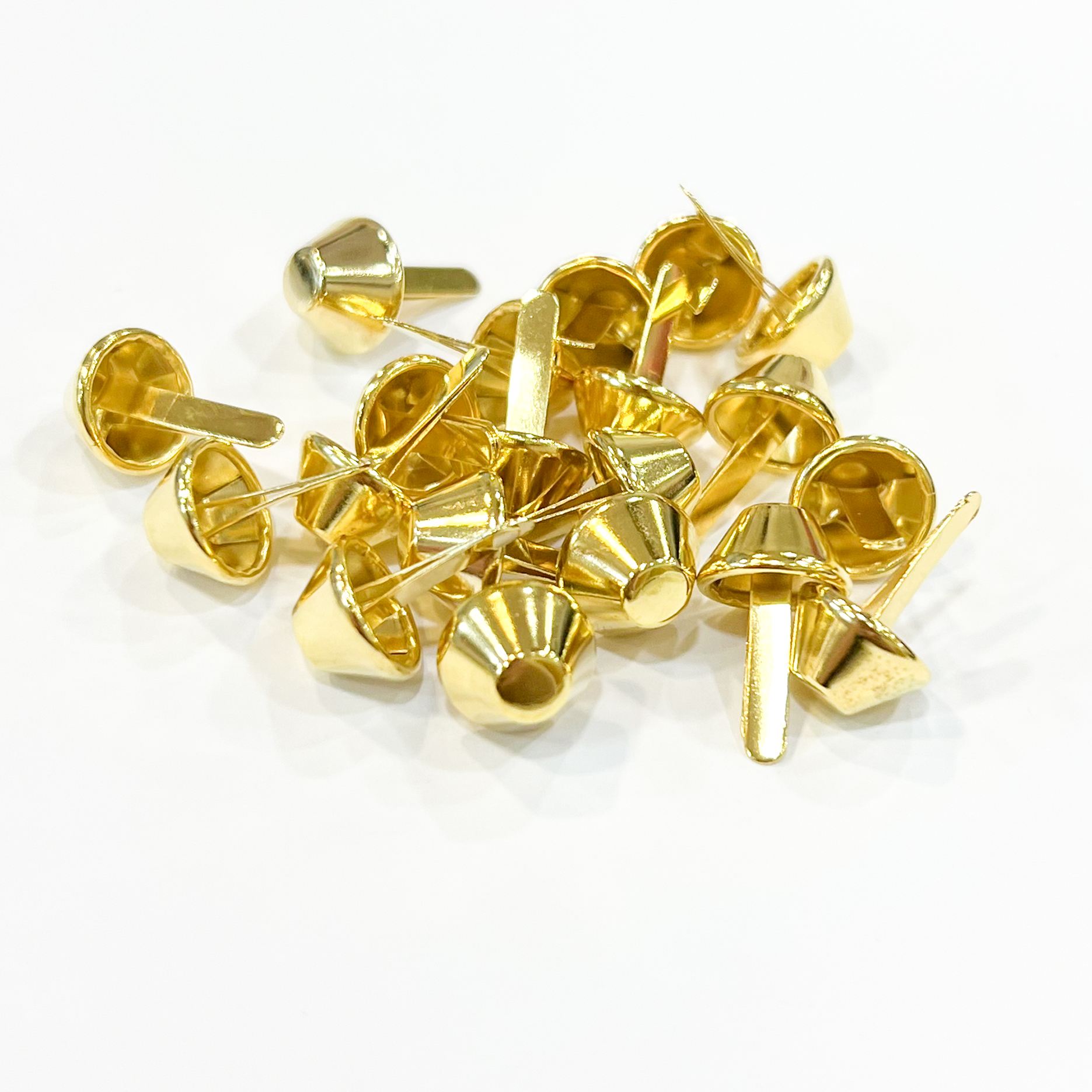 Tachas cónicas metálicas disponíveis em várias cores e tamanhos — perfeitas para personalizar peças de vestuário, calçado, malas e mochilas. Além do uso decorativo, também são ideais como “pézinhos” na base das malas, oferecendo proteção e um acabamento profissional.